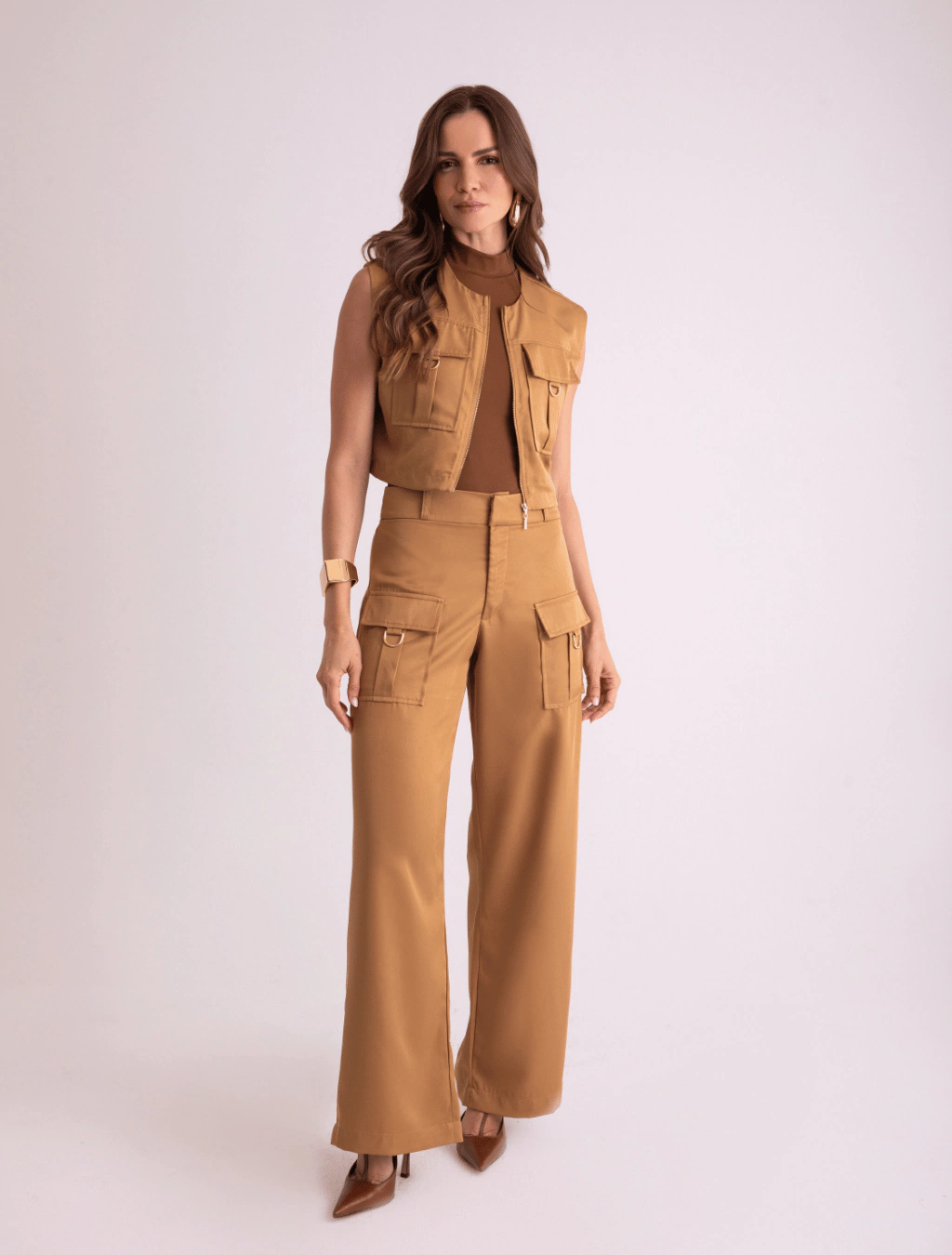 A Blusa Laura é uma peça moderna e funcional, confeccionada no tecido plano que garante sofisticação e caimento impecável. Sua modelagem levemente ampla proporciona conforto sem perder a elegância. O destaque fica para o bolso utilitário com meia argola gold, detalhe que se conecta perfeitamente à Calça Laura, criando um conjunto harmônico. O fechamento com zíper frontal traz um toque contemporâneo e prático ao design.