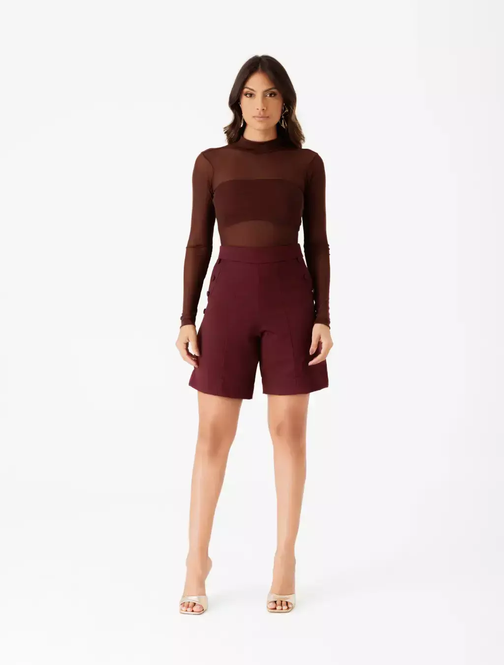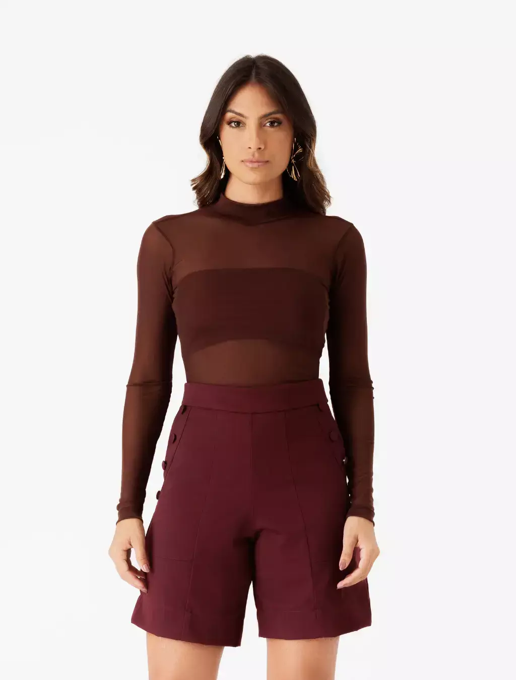 O Body Pauline é confeccionado em tule, oferecendo transparência delicada e sofisticação. Com mangas longas e gola alta, a peça traz elegância e versatilidade. Possui fechamento na parte inferior e top interno opcional, permitindo conforto e diferentes formas de uso, ideal para composições modernas e estilosas.