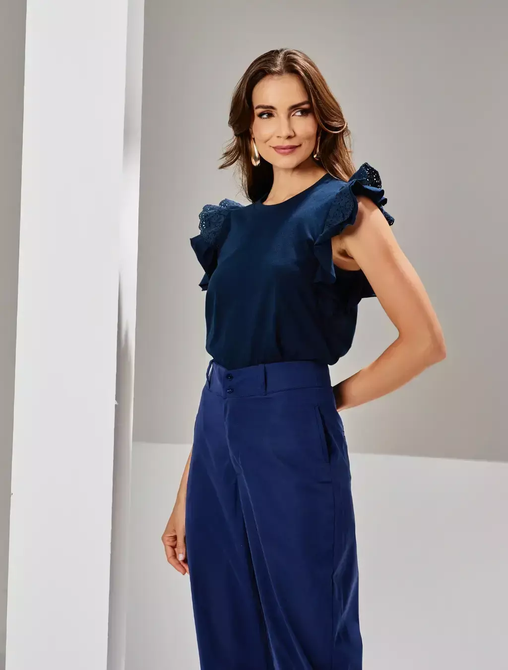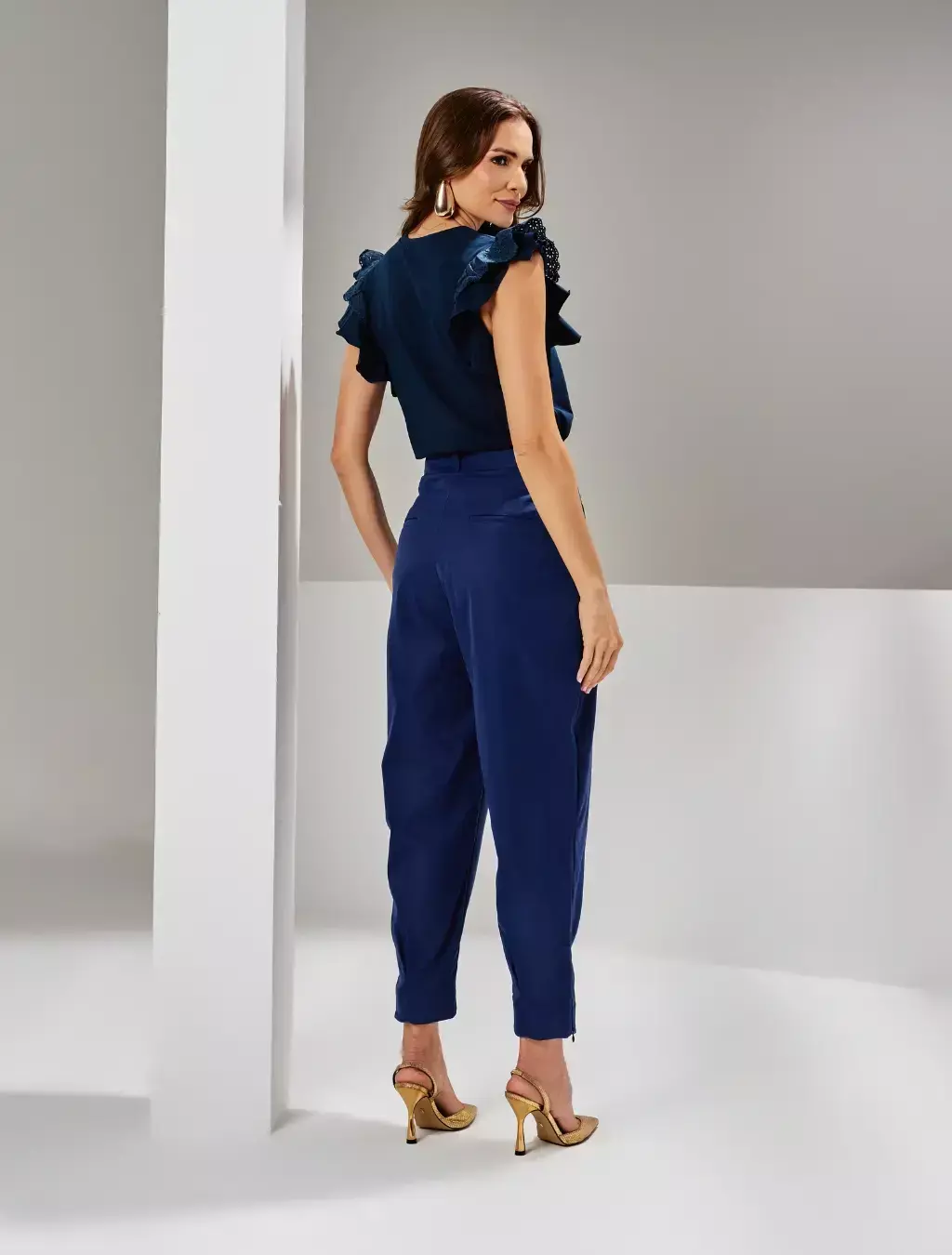 A Calça Betina é confeccionada em tecido plano com corte de alfaiataria, unindo elegância e conforto em uma peça moderna. Apresenta detalhe de zíper na barra, bolso faca e fechamento frontal com botões, proporcionando praticidade e sofisticação. Ideal para composições versáteis, do office look a produções casuais refinadas.