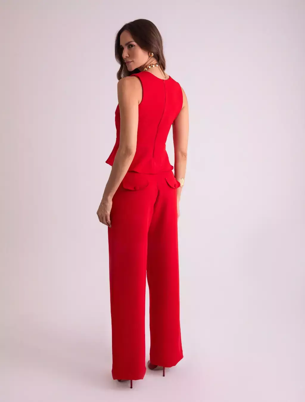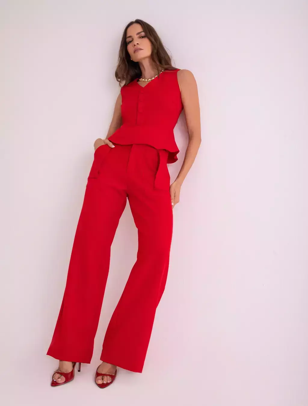 A Calça Lídia traduz a sofisticação da alfaiataria em uma peça versátil e atemporal. Confeccionada em tecido plano de alta gramatura, traz corte de alfaiataria e modelagem reta, garantindo caimento elegante. Seu design é valorizado pelos bolsos externos com lapela, o charme dos botões cobertos, além das lapelas traseiras que complementam o visual refinado. O fechamento no cós é feito com colchetes e botão de segurança, assegurando praticidade e acabamento impecável.