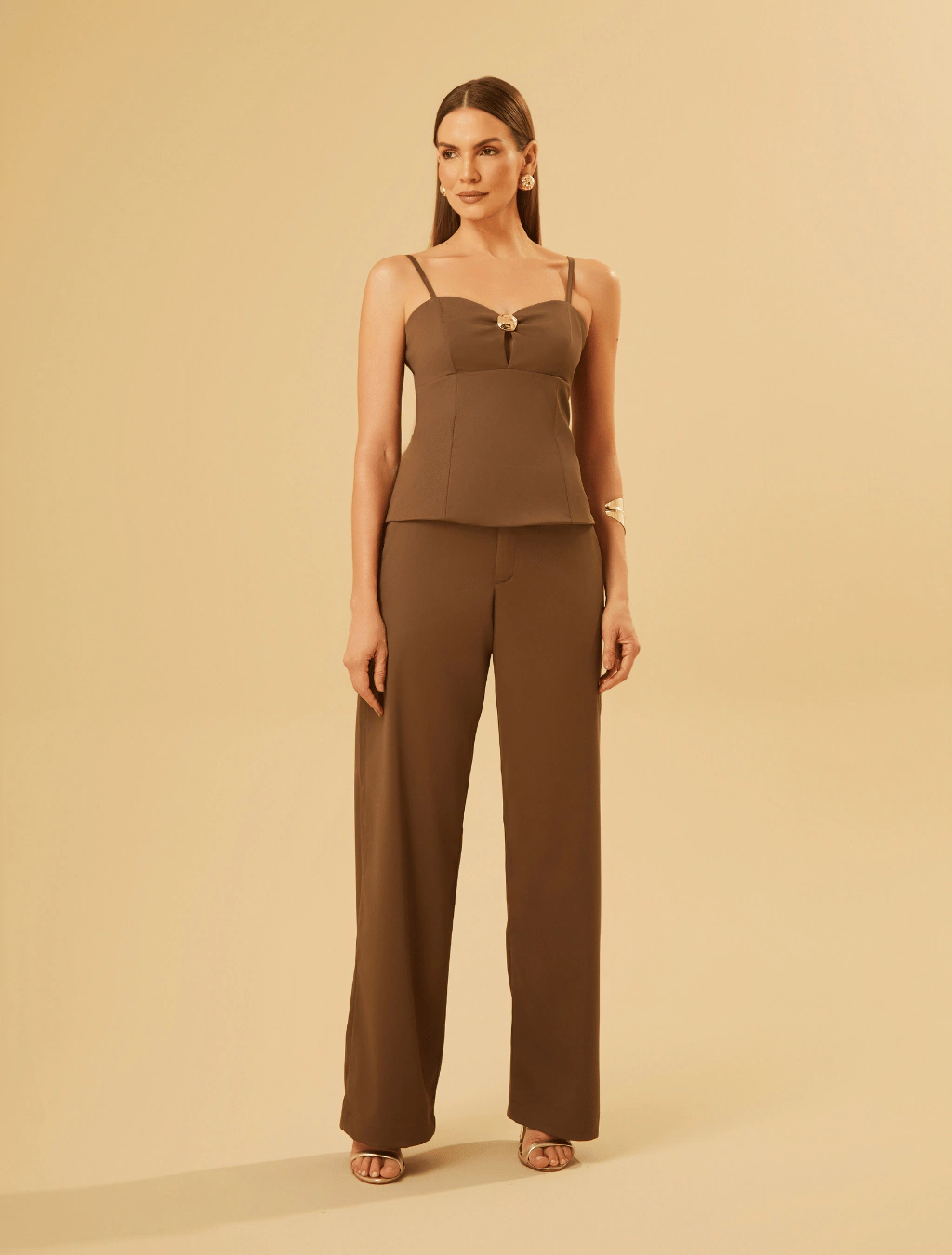 A Camiseta Helena é a escolha perfeita para quem busca elegância em cada detalhe. Confeccionada em tecido plano de fibra sintética com corte de alfaiataria, a peça traz alças finas reguláveis e recortes no corpo que valorizam e alongam a silhueta. O destaque especial fica por conta do decote adornado com aviamento redondo orgânico em tom gold, que adiciona sofisticação e um toque moderno à produção.