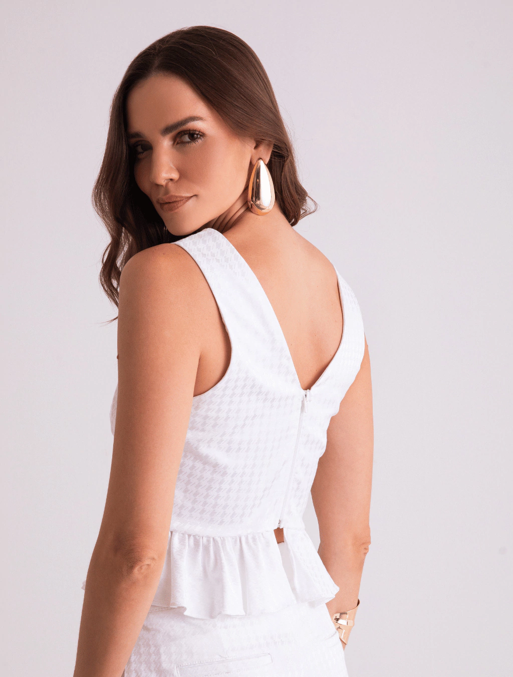 A Peplum Isadora é confeccionada em jacquard com estampa sur ton de pied-de-poule, trazendo elegância atemporal e sofisticação ao look. Seu recorte abaixo do busto em formato losango valoriza e afina a silhueta, enquanto o babado clássico da peplum confere feminilidade e movimento. Uma peça versátil e refinada para ocasiões especiais ou para elevar produções do dia a dia.
