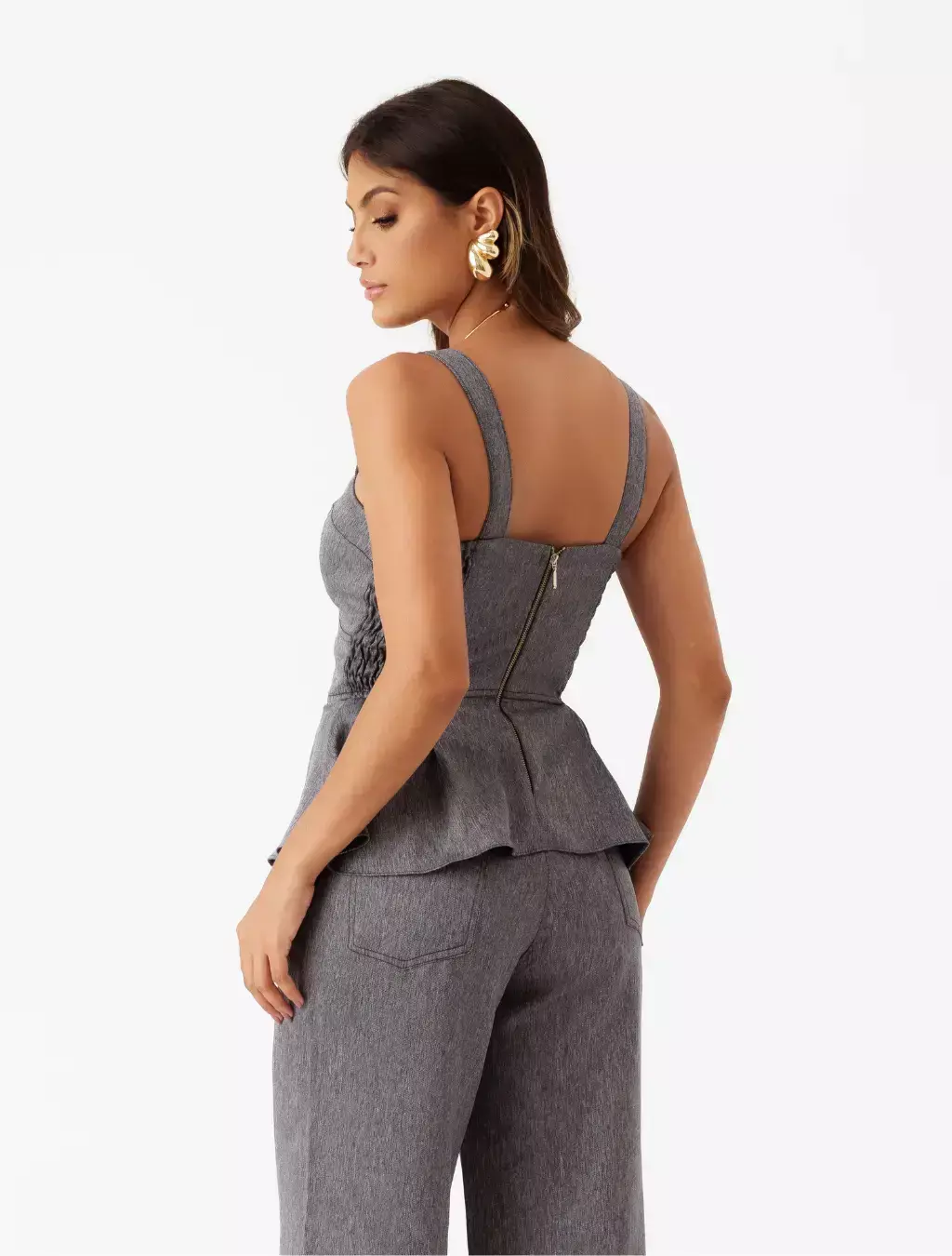 Peplum Lorenza é sinônimo de elegância com um toque moderno. Confeccionado em tecido plano de fibra sintética com visual denim, o modelo traz recortes no busto que valorizam a silhueta e um decote coração que realça o colo de forma delicada. O recorte na cintura com peplum e pregas adiciona movimento e sofisticação à peça, enquanto as alças largas e o elastex nas costas garantem conforto e melhor ajuste ao corpo. O fechamento posterior é feito por zíper de metal, conferindo um acabamento refinado e contemporâneo.