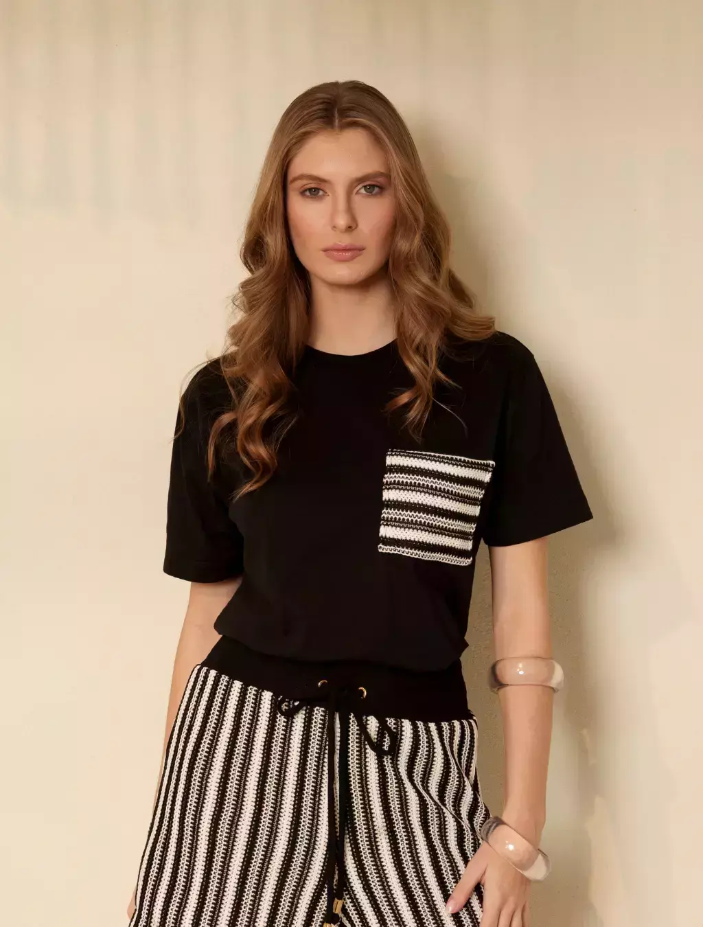 O diferencial fica por conta do bolso aplicado na altura do busto, feito em tricot com listras em preto e branco, que adiciona textura, contraste e personalidade à peça. Com modelagem confortável e versátil, a T-shirt Mel é perfeita para compor looks casuais com um toque moderno e criativo.