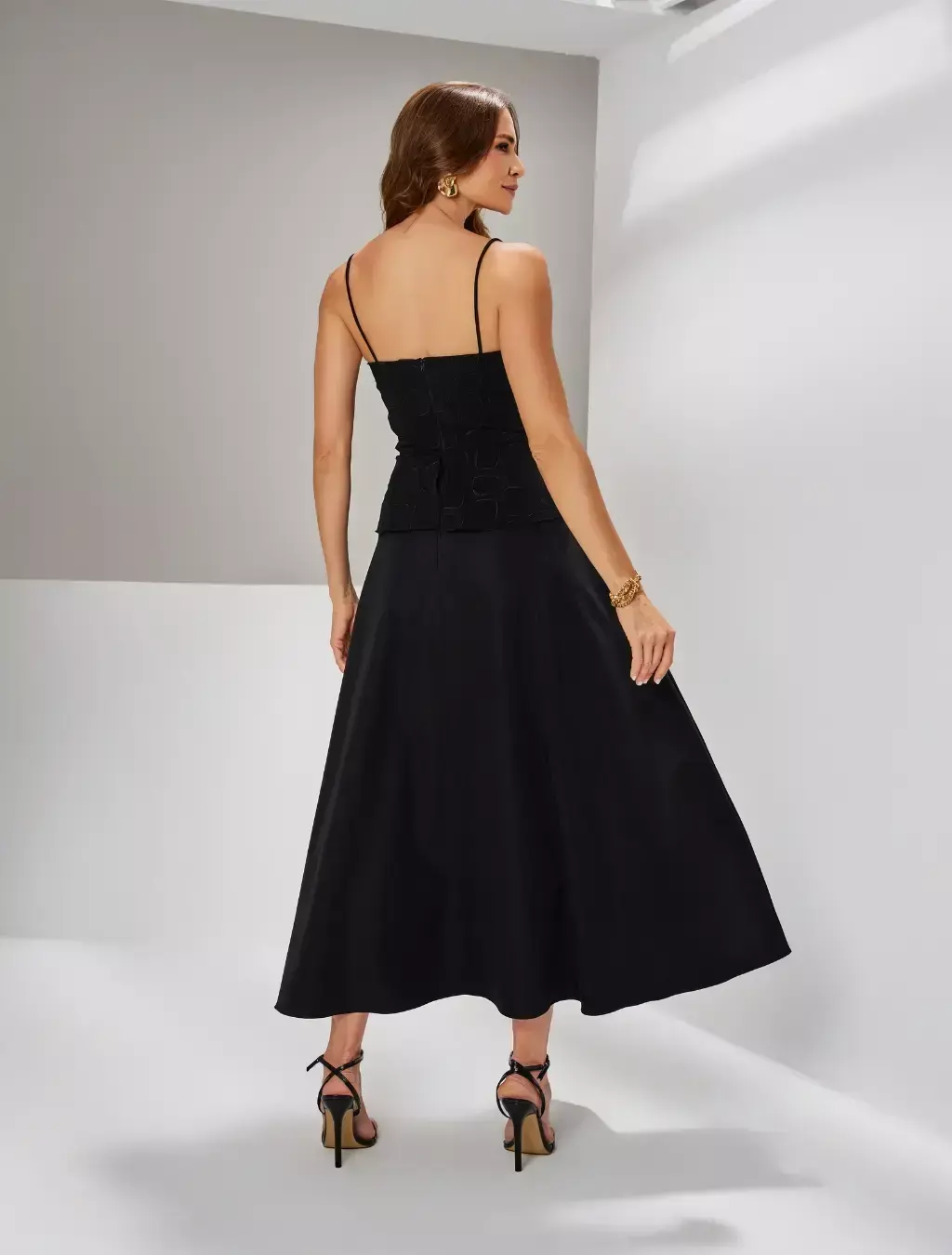O Vestido Grazi é confeccionado em crepe texturizado combinado ao tecido plano de fibra sintética, criando um contraste sutil entre estrutura e fluidez. Com comprimento midi e busto modelado estilo corset, valoriza a silhueta com elegância. O decote em V, todo em crepe com textura de maxi poá, adiciona um toque delicado e sofisticado. A saia rodada traz movimento e leveza, enquanto as alças finas e o fechamento nas costas com zíper completam o acabamento refinado da peça.