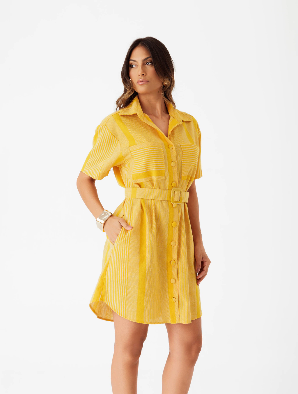O Vestido Kaylane traz a sofisticação do estilo chemise em uma versão moderna e versátil. Confeccionado em linho com viscose, o modelo possui fechamento frontal com lapela e botões cobertos, garantindo um visual elegante e atemporal. Os bolsos aplicados na altura do busto e os bolsos faca agregam praticidade e charme à peça. As leves pences nas costas proporcionam melhor ajuste ao corpo, realçando a silhueta de forma sutil. Para finalizar, o vestido acompanha cinto coberto no mesmo tecido, permitindo diferentes formas de uso e composição.
