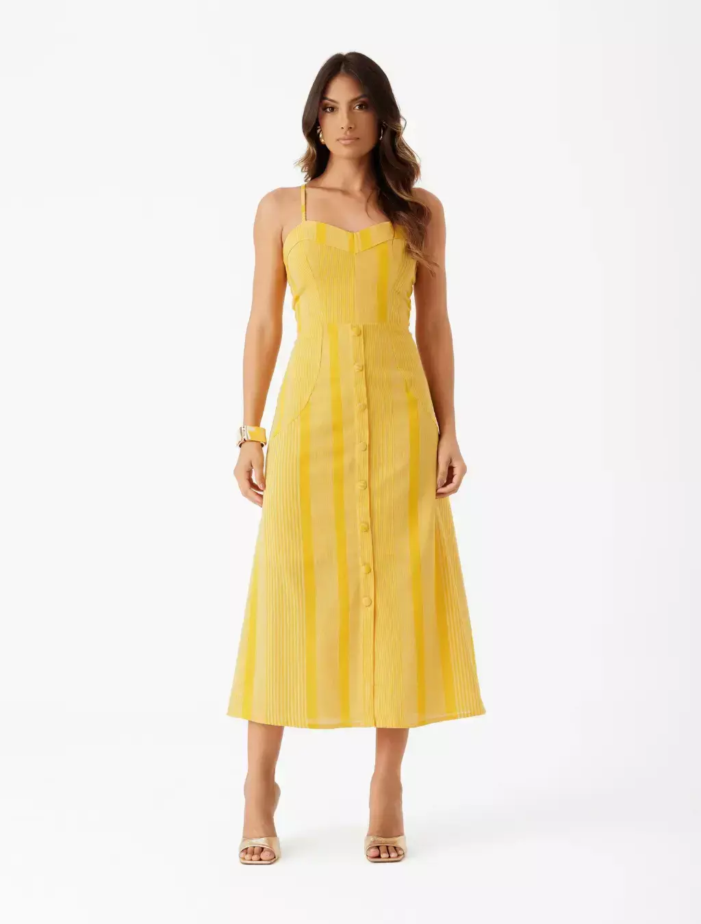 O Vestido Midi Kaylane é a escolha perfeita para quem busca elegância com leveza. Confeccionado em linho com viscose, o modelo apresenta recortes no busto que valorizam a silhueta e um decote coração que traz um toque romântico e feminino. As alças finas reguláveis permitem melhor ajuste ao corpo, enquanto a saia rodada garante movimento e fluidez. O design é complementado por uma lapela aplicada com botões cobertos, detalhe que adiciona sofisticação ao visual. Nas costas, elásticos e fechamento por zíper proporcionam conforto e praticidade no vestir.