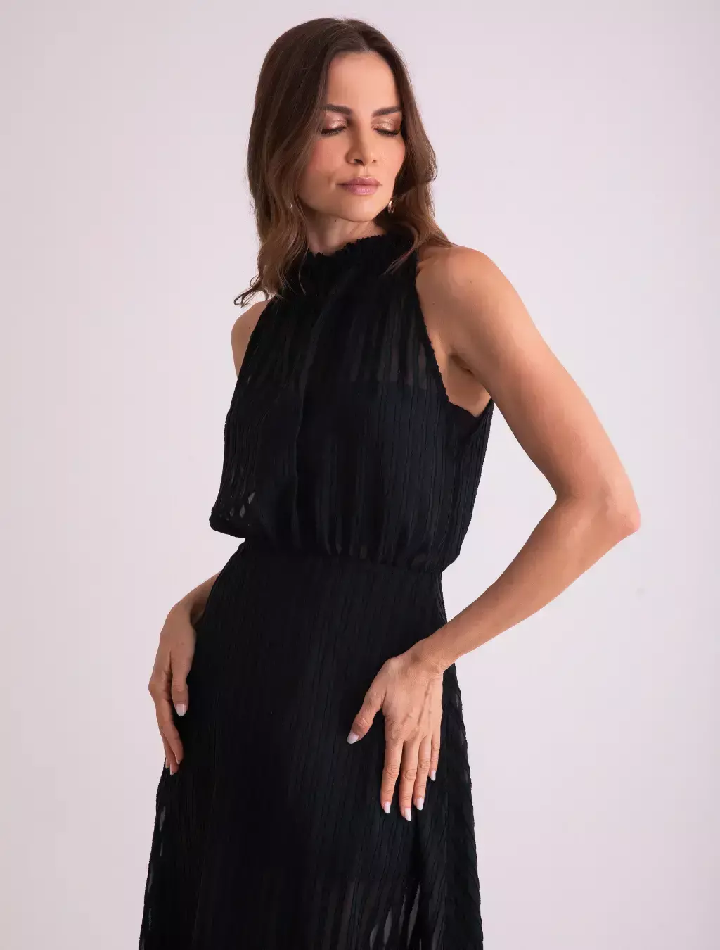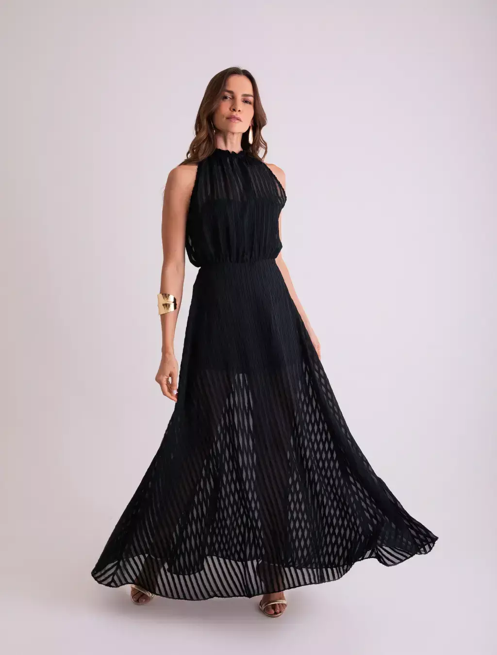 O Vestido Pérola é confeccionado em crepe texturizado com leve transparência, trazendo sofisticação e elegância. Conta com top interno estruturado com barbatanas para melhor caimento, short interno que proporciona conforto e liberdade de movimento, e fechamento nas costas com botões, garantindo praticidade. Uma peça glamourosa e versátil, perfeita para ocasiões especiais.