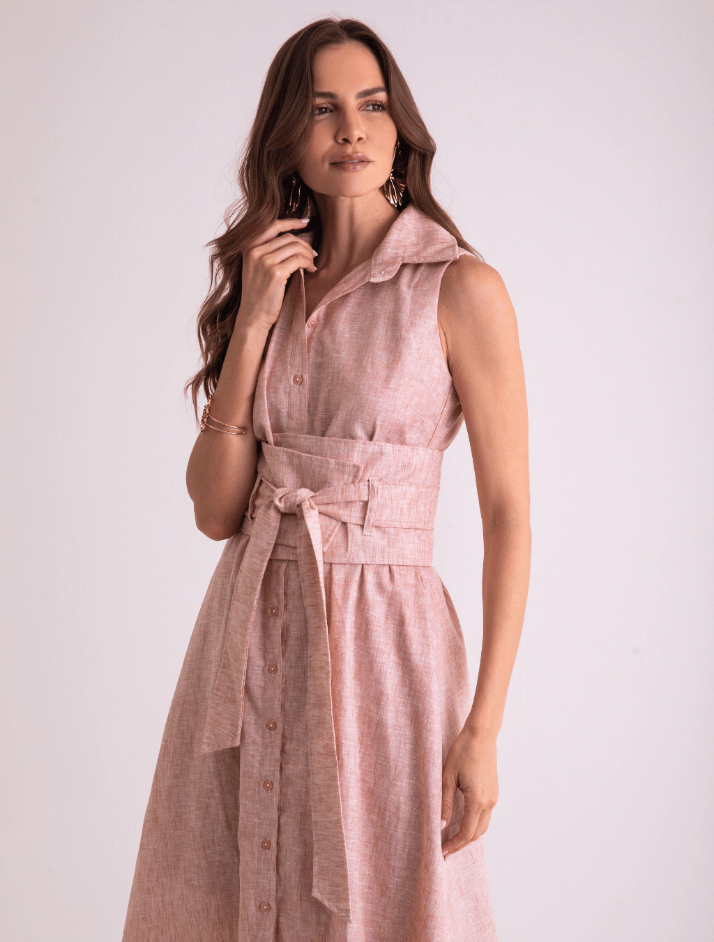 O Vestido Rose é confeccionado em cambraia de algodão, unindo frescor e sofisticação. Em comprimento midi, a peça apresenta fechamento frontal com botões de massa tingidos, detalhe que reforça sua elegância. A faixa larga na cintura traz informação de moda e valoriza a silhueta, enquanto a gola polo adiciona um toque moderno e atemporal ao design.